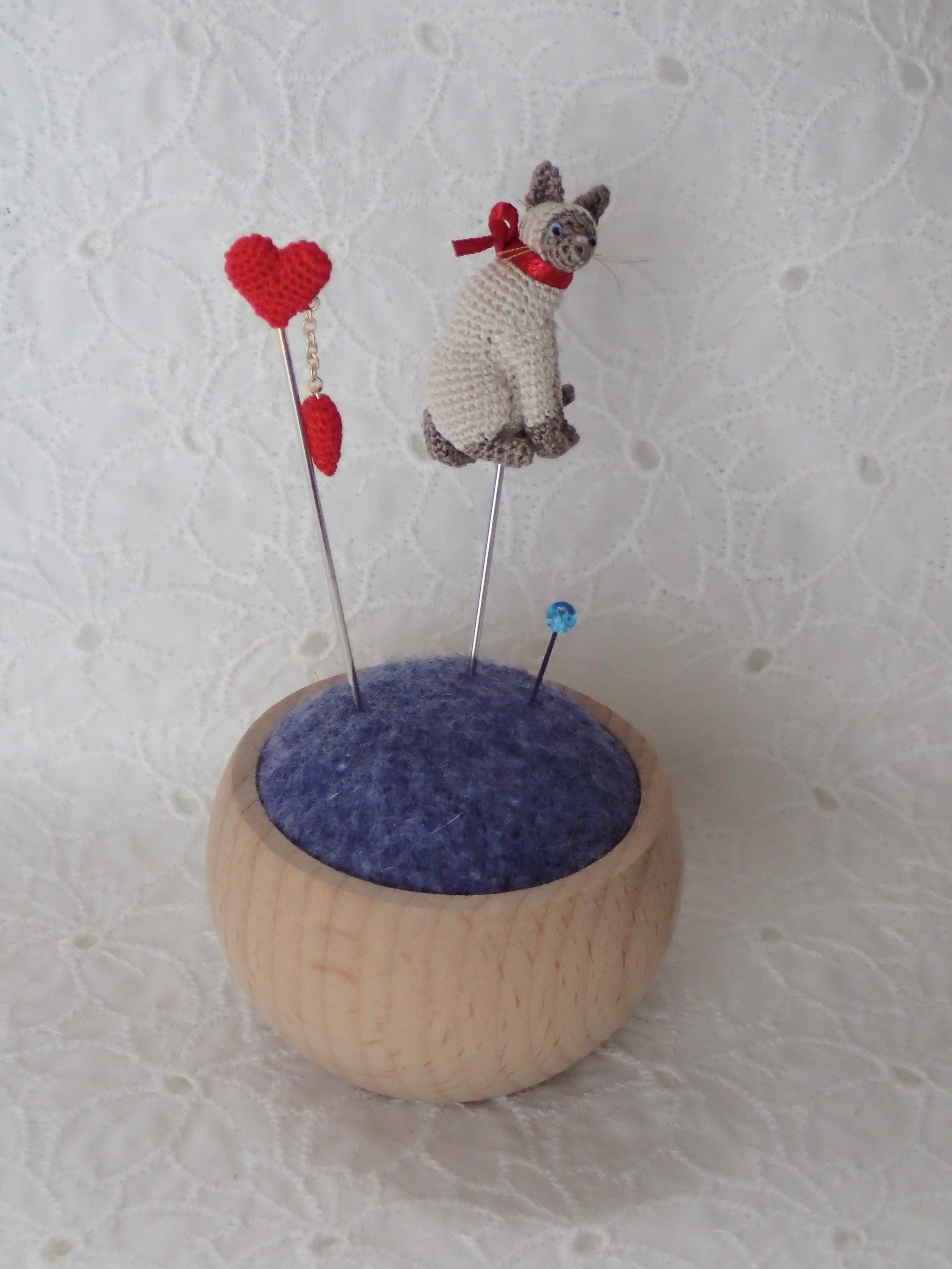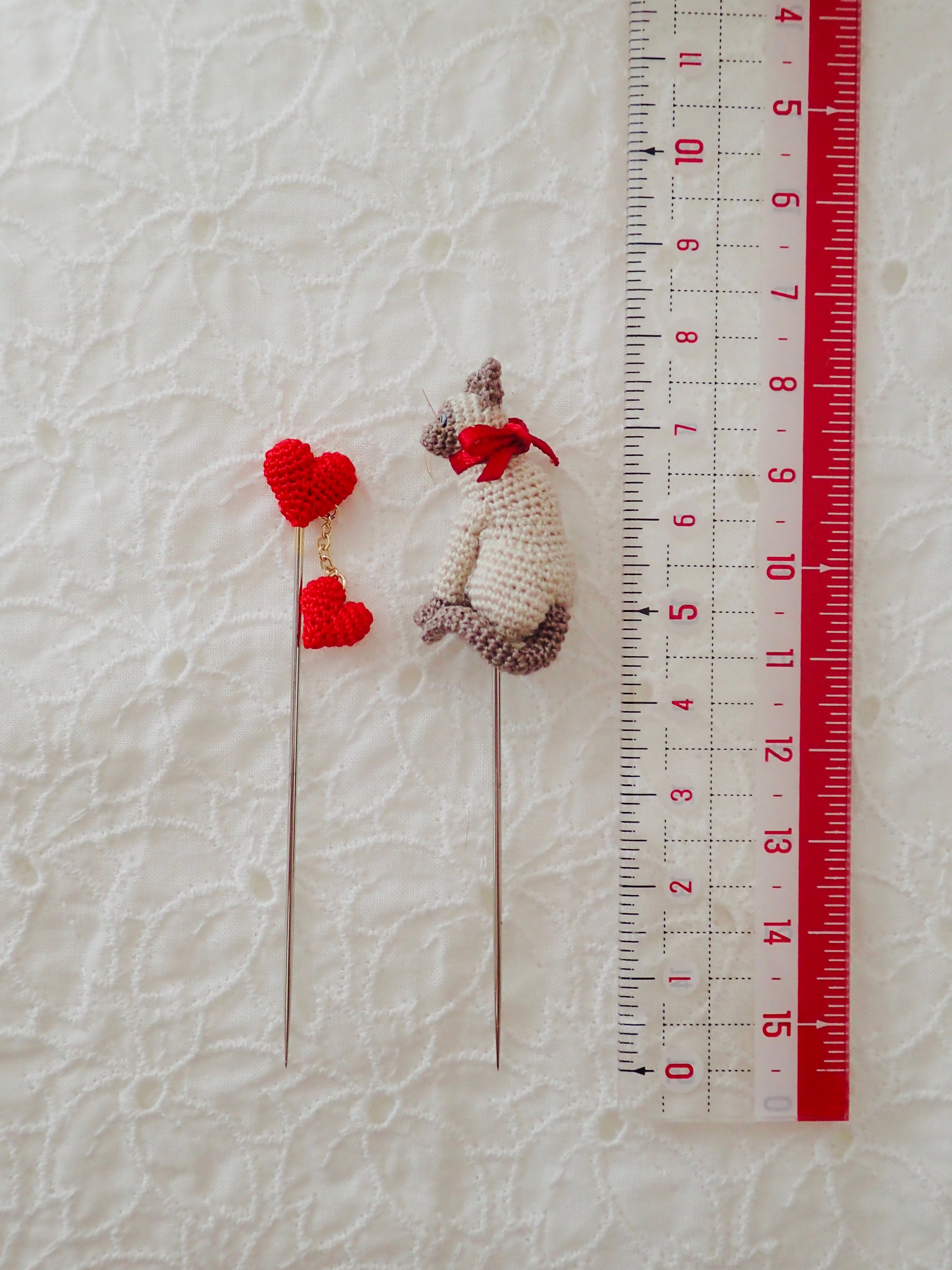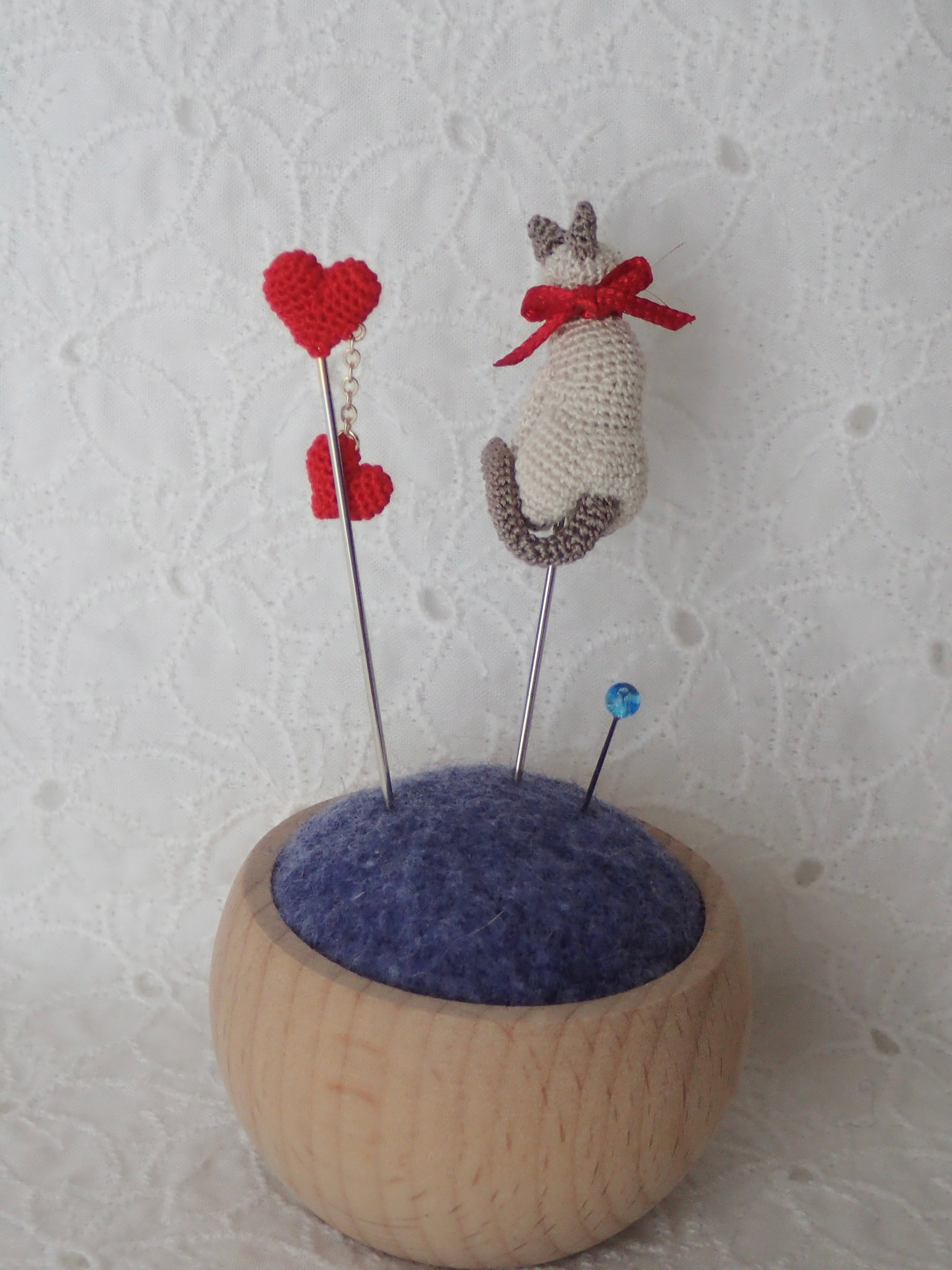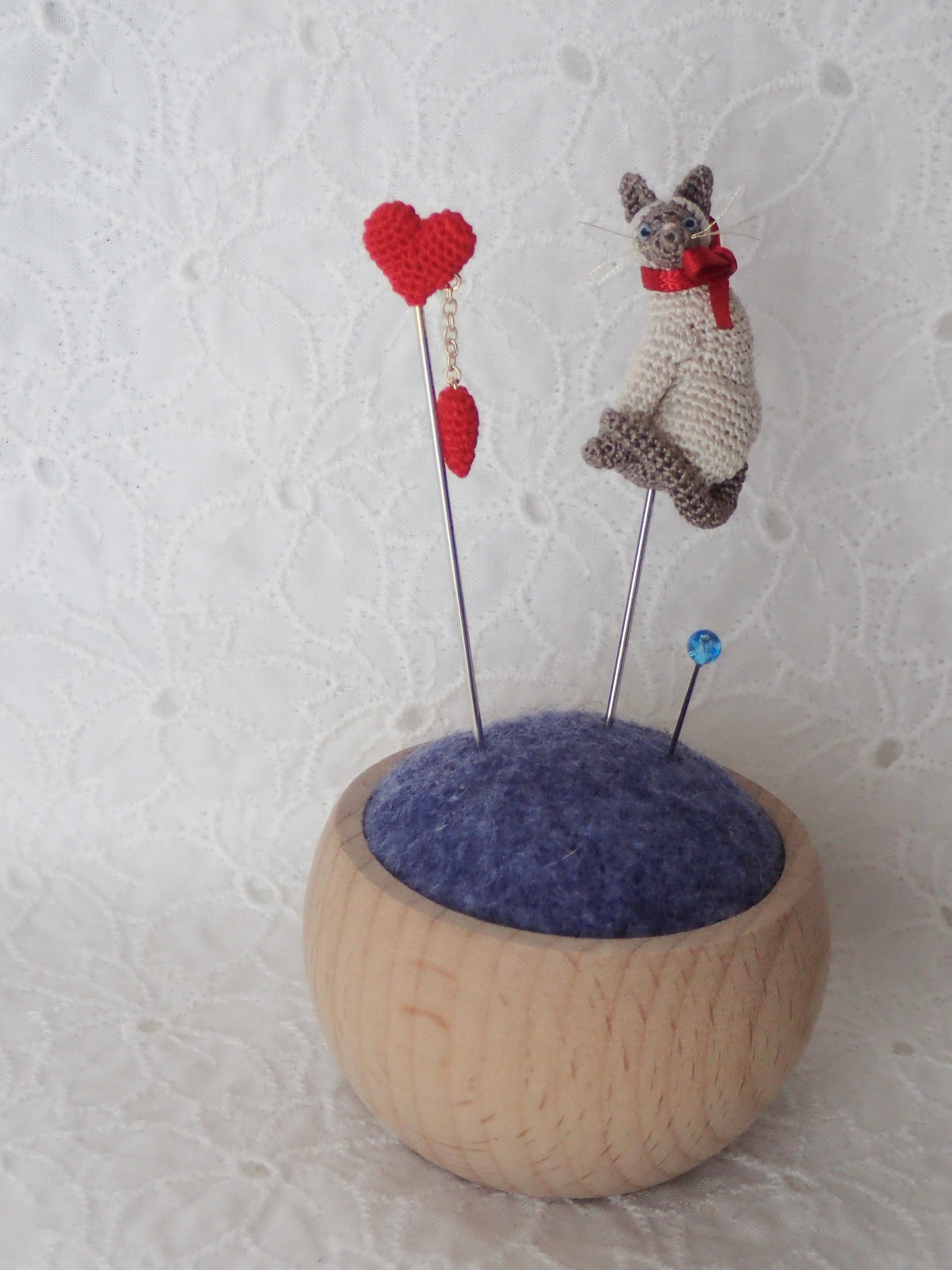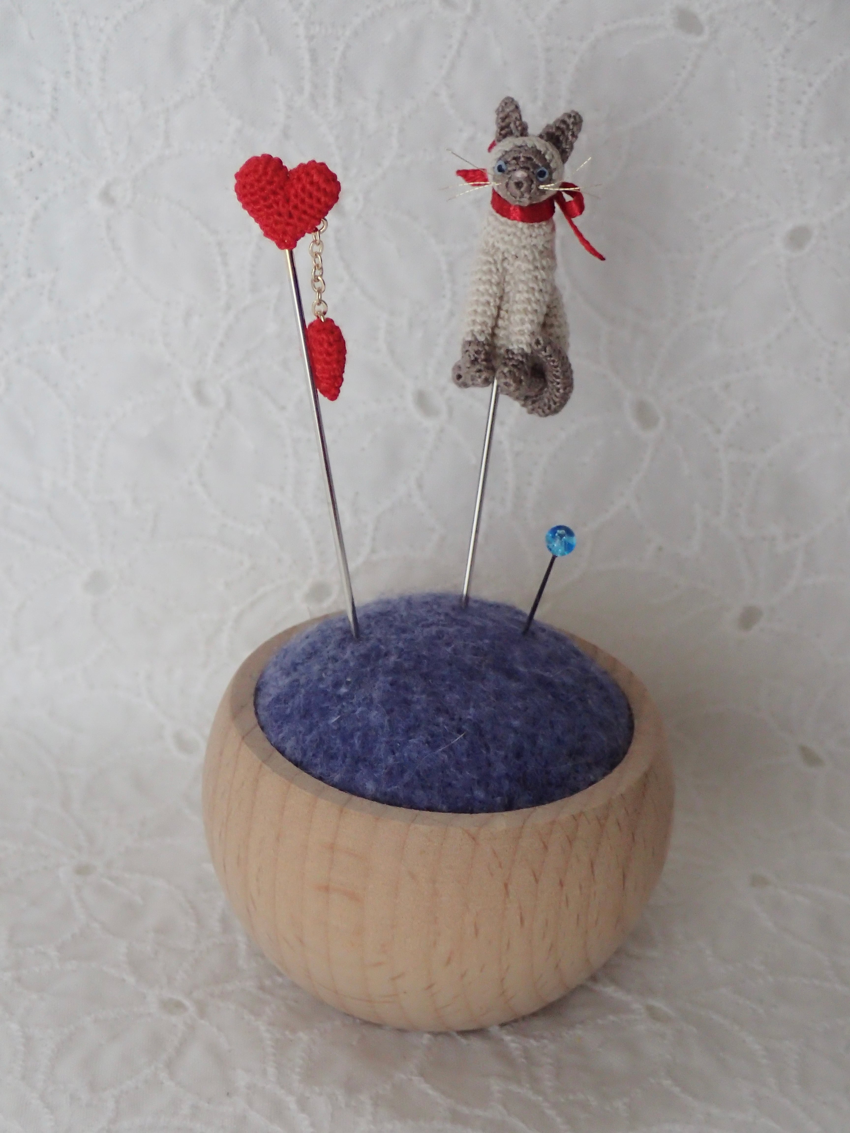 小さなあみぐるみの猫ちゃんが、あなたのハンドメイドの時間を可愛く彩ります。このまち針は、自分へのご褒美として、あるいは大事な人へのプレゼントにも最適です。