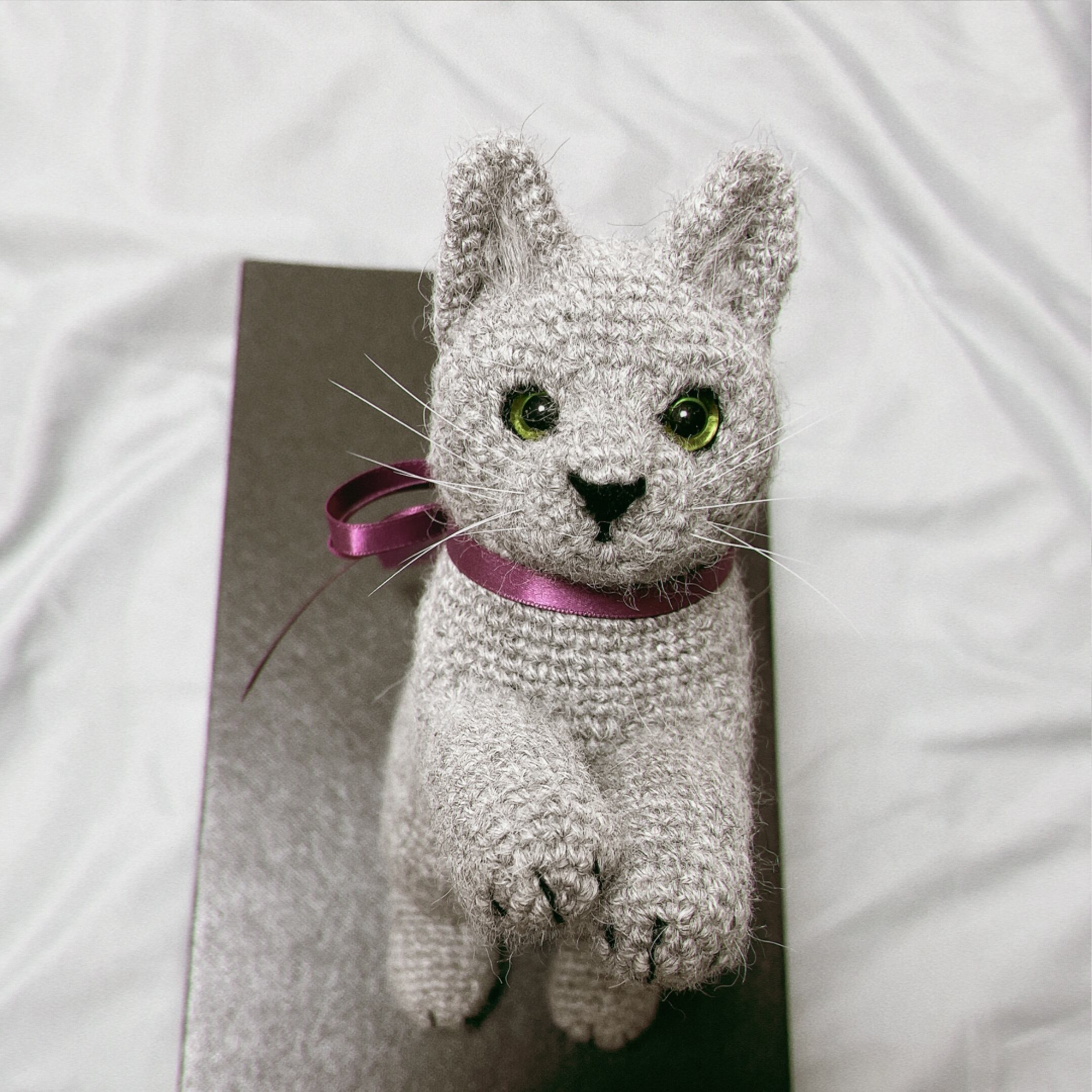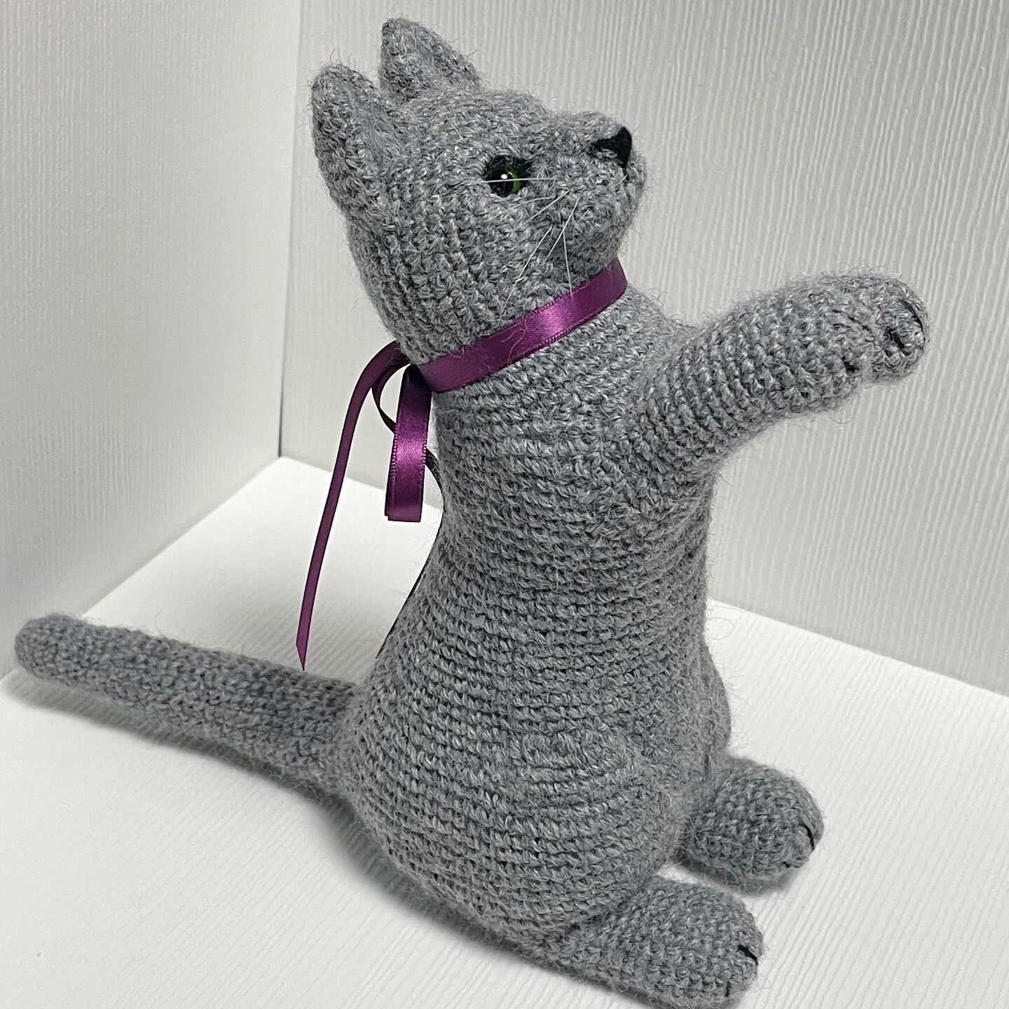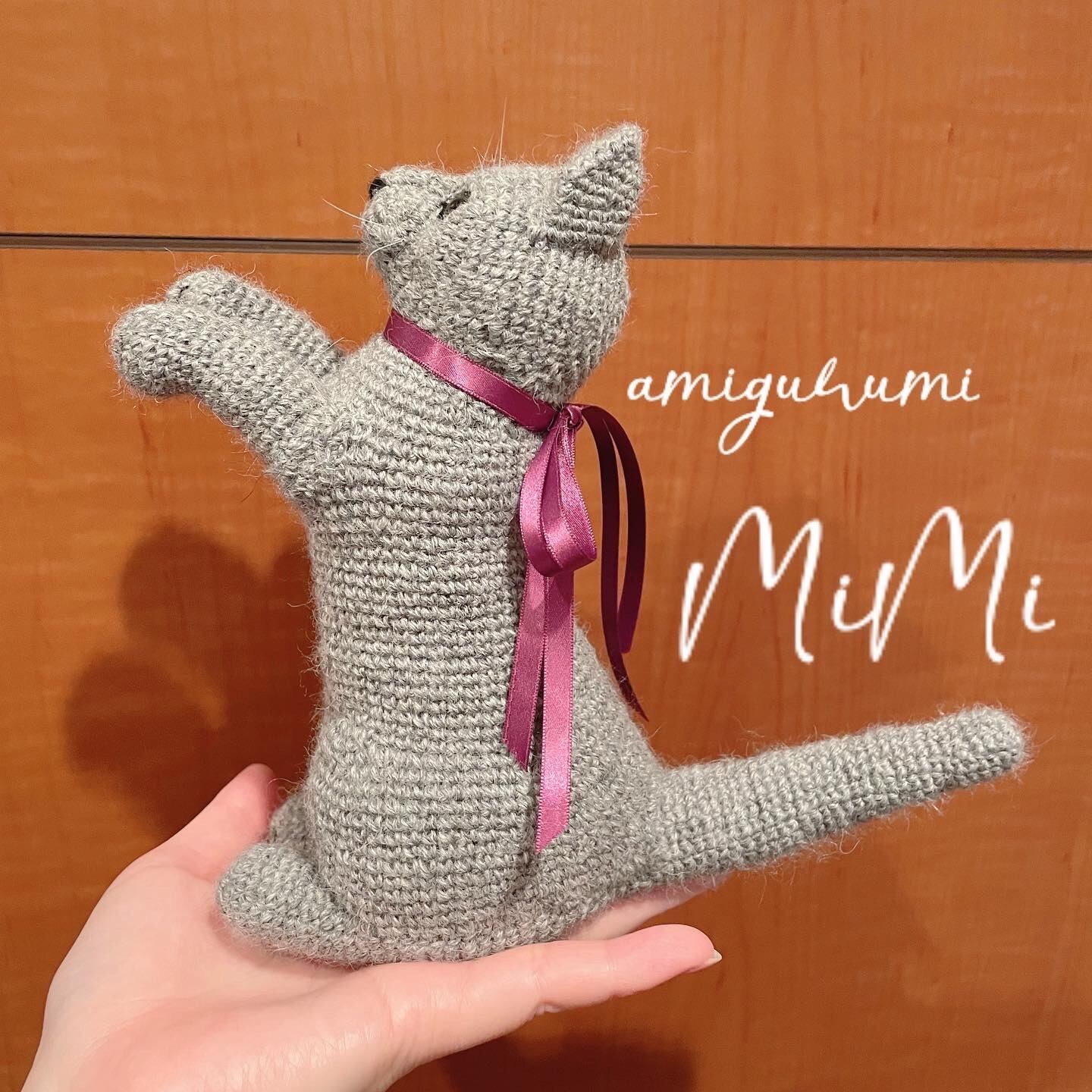 ベビーアルパカの毛糸で編んだ手乗りサイズの猫ちゃんのあみぐるみです。